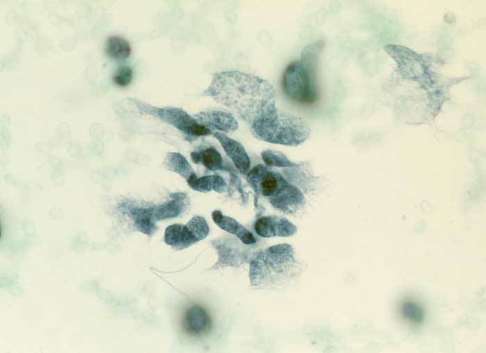 Bürstenzytologie Mittellappen: Die atypischen Zellen sind spindelig und zeigen ein unterschiedlich grob granuliertes Pfeffer und Salz Chromatin, was zu einem neuroendokrinen Tumor passen könnte. Kerne und Zytoplasma sind fragil.