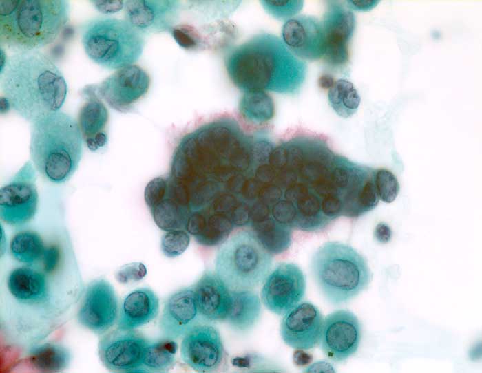 Kugeliger Verband hypertropher Flimmerzellen. Die Zellkerne sind gross, aber nicht atypisch. Das