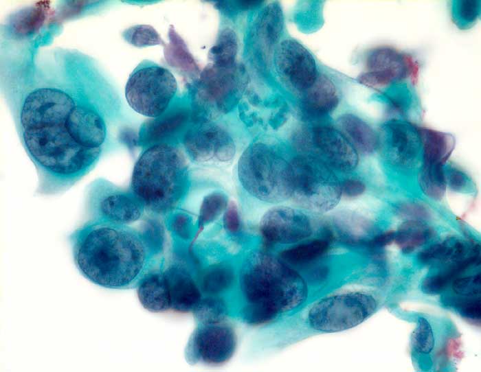 Lockerer Verband grosser, teils mehrkerniger Zellen mit vesikulären Kernen, leicht vergröbertem Chromatin und Makronukleolen.
