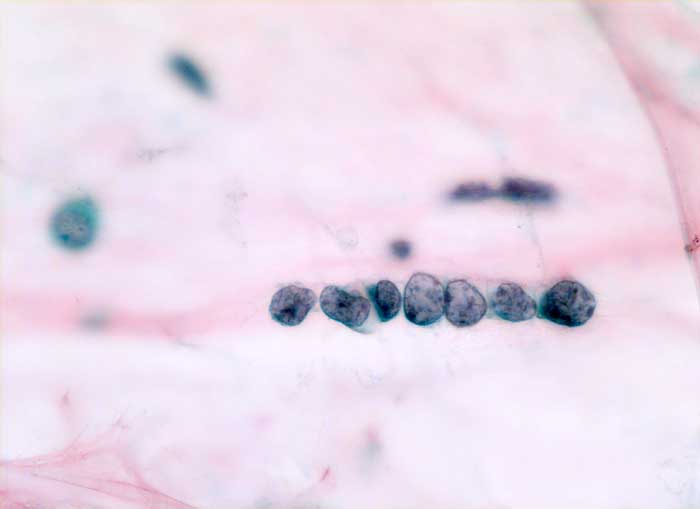 Zeilenförmiger Tumorzellverband. Die Tumorzellkerne sind polymorph, entrundet und zeigen eine vergröberte Chromatinstruktur. Der Zytoplasmasaum ist sehr schmal. Nukleolen sind nicht erkennbar.