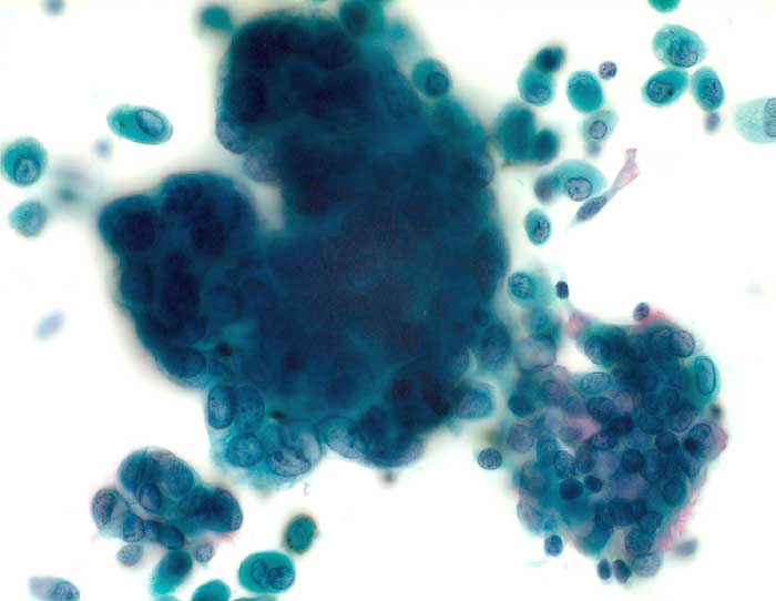 Zwei Creolakörperchen mit am Rand erkennbaren Flimmerhaaren. Daneben ein kompakter dreidimensionaler Verband eines Adenokarzinoms mit deutlich grösseren vesikulären Kernen mit grober strukturiertem Chromatin. Beim Karzinomzellverband sind am Rand keine Flimmerhaare erkennbar.