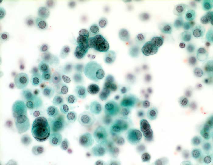 Pleuraerguss: neben zahlreichen Makrophagen und Mesothelzellen kleine dichte Aggregate atypischer Tumorzellen mit Kernen, die etwa doppelt so gross sind wie die Kerne von Makrophagen. Das Zytoplasma ist sehr schmal. Die Kerne liegen dicht an dicht aneinander gelagert und verformen sich gegenseitig (nuclear molding). Polymorphe Kerne mit Pfeffer und Salz Chromatin.