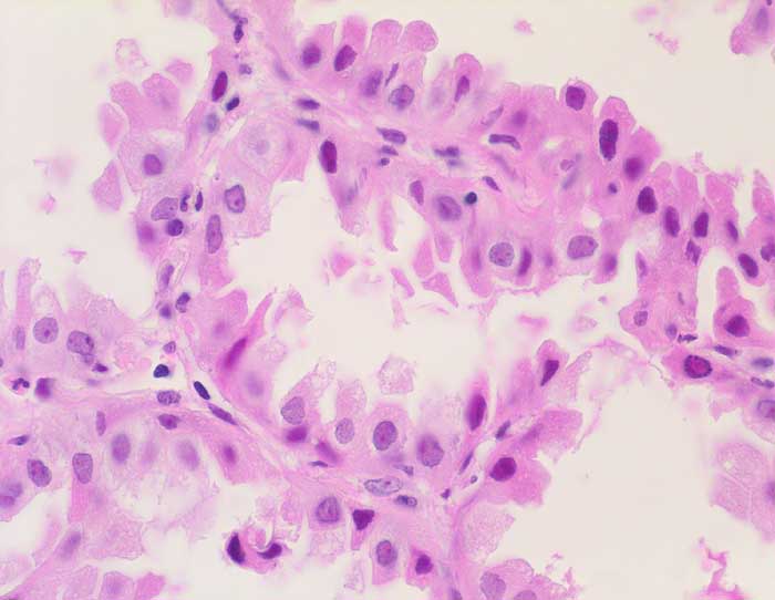 Die dünnen Alveolarsepten werden von hochprismatischen Zellen mit Hobnailaspekt ausgekleidet. Die Kernatypien sind äusserst gering.