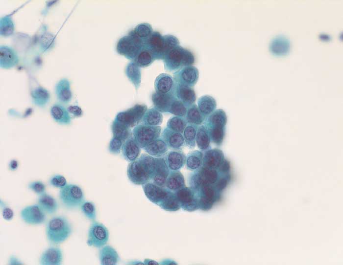 Polygonale Tumorzellen bilden einen unregelmässig geformten Verband. Die Kerne sind hyperchromatisch und teilweise gekerbt. Die Chromatinstruktur ist vergröbert. Hohe Kern-Zytoplasma Relation.
