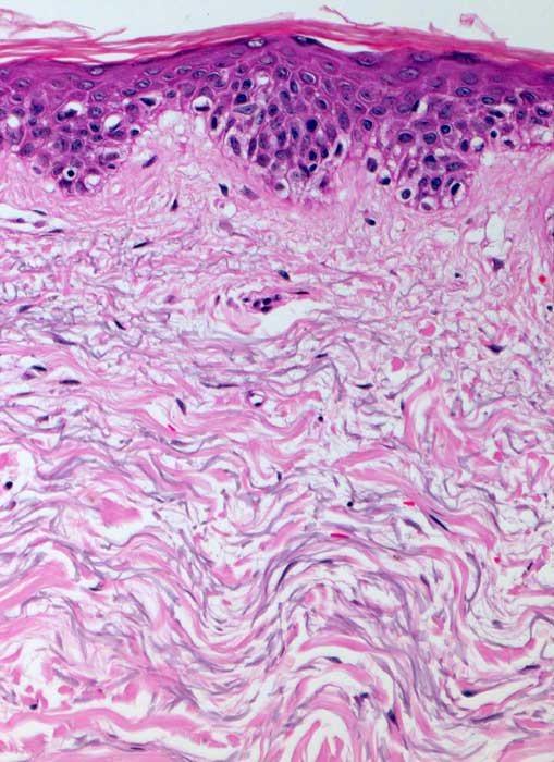 Zahlreiche grau gefärbte Fasern in der Dermis sprechen für eine deutliche aktinische Schädigung der Haut.