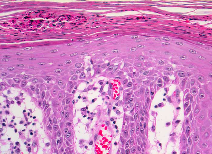 Schlanke verlängerte Reteleisten. Fokale Spongiose. Neutrophilenreiche Parakeratosekappe unter Ausbildung eines Munro-Mikroabszesses. Fehlendes Stratum granulosum. Ödematöses Stratum papillare mit ektatischen Gefässen und lymphozytärem Entzündungsinfiltrat. Insgesamt liegt das Bild einer spongiotisch-psoriasiformen Dermatitis vor.