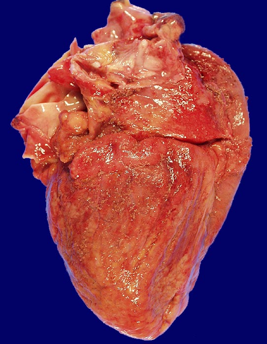 Braune Verfärbung des Perikards als Folge des hämorrhagischen malignen Perikardergusses. Perikard mit zottigen Auflagerungen (Perikardkarzinose)