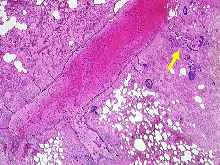 ► Blaue Bakterienhaufen in einem Pulmonalarterienast und im angrenzenden Lungenparenchym. Lungenödem und Hämorrhagien.