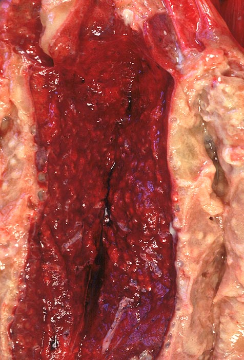 Das Empyem ist definiert als eitrige Entzündung in einem vorgebildeten Hohlraum wie Pleura, Peritoneum, Herzbeutel, Gelenkspalt, Galenblase, Augenvorderkammer. Das Empyem entsteht meist dadurch, dass eine eitrige Entzündung eines Organs in den angrenzenden Hohlraum durchbricht. In diesem Fall war das Empyem Folge der schweren Bronchopneumonie.