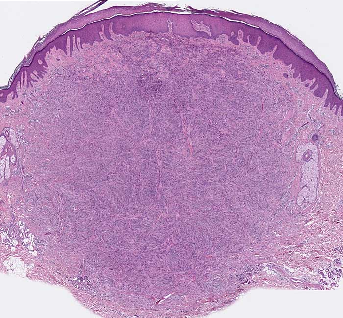 Die Epidermis zeigt eine leichte Hyperkeratose und Akanthose. Von der Epidermis durch eine schmale Kollagenfaserschicht abgegrenzt findet sich in der Dermis ein zellreicher spindelzelliger kugeliger Tumor mit unscharfer Begrenzung.