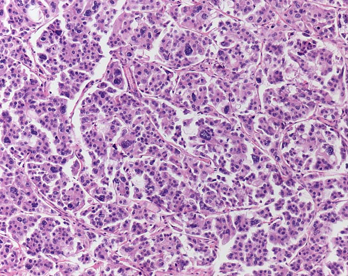 Invasive Tumorkomponente bestehend aus mikropapillären Zellproliferaten, die typischerweise innerhalb von Lakunen liegen. Zwischen den einzelnen Mikropapillen schmale Bindegewebssepten mit Kapillaren. Einzelne Tumorzellen zeigen grosse polymorphe und hyperchromatische Kerne. Das Bild erinnert stark an ein serös papilläres Ovarialkarzinom.