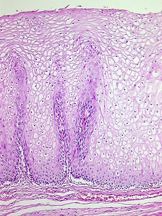 Plattenepithelzellen mit pflanzenzellartig aufgetriebenem hellem Zytoplasma aufgrund vermehrter Glykogeneinlagerungen. Ausserdem verlängerte Papillen als Hinweis auf Reflux.