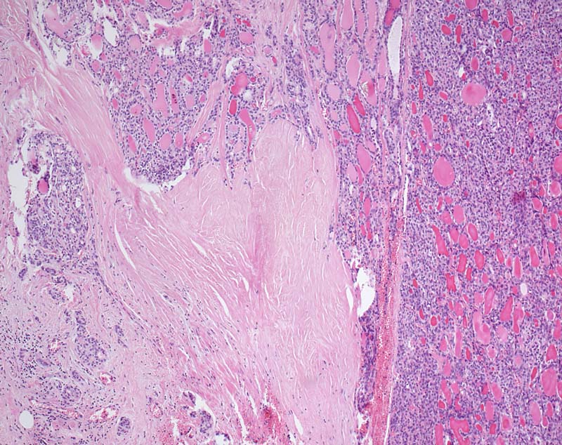 Kapseldurchbrüche mit ausgedehnter Invasion des benachbarten Gewebes fanden sich an zahlreichen Stellen. Somit handelt es sich um ein grob invasives follikuläres Karzinom.