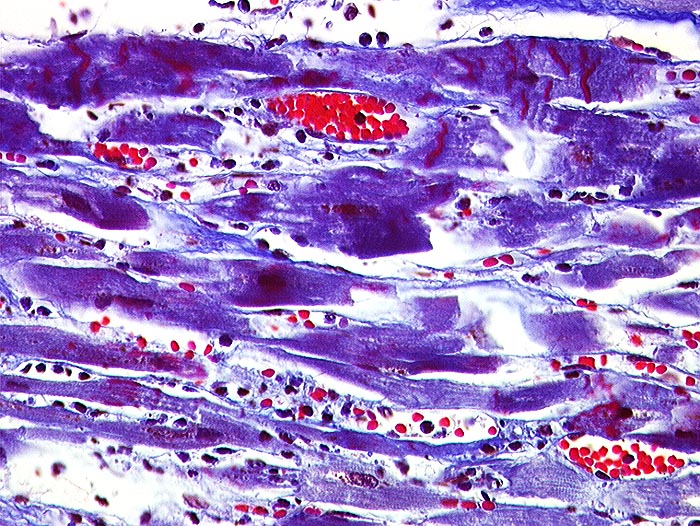 Quer zu den Myozyten verlaufende rot gefärbte Kontraktionsbänder. Granulozytäres Infiltrat rechts im Bild.