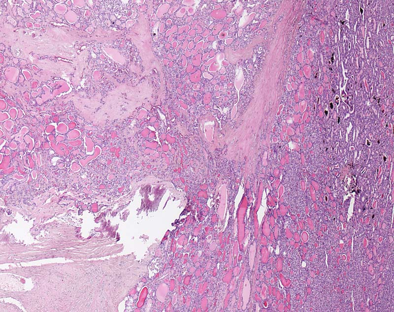 Der follikuläre Tumor durchbricht die dicke bindegewebige Kapsel und infiltriert breitflächig das angrenzende Gewebe (links im Bild).