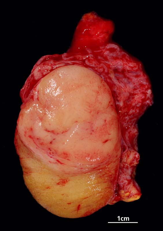 Scharf begrenzter crèmefarbener Tumor des Hodens (Gewebe unfixiert).