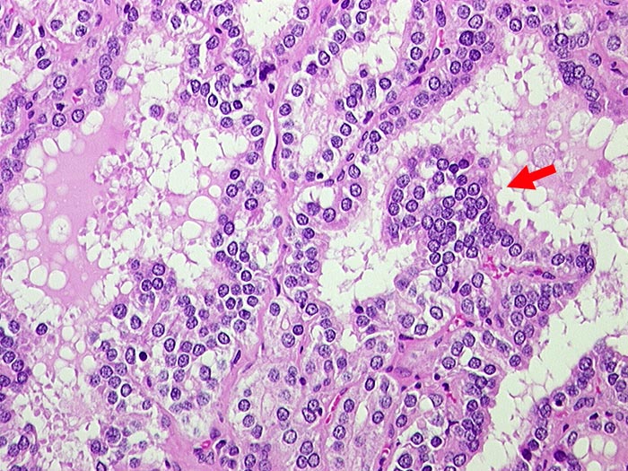 Follikellumina gefüllt mit wenig hellem Kolloid. Grosse Resorptionsvakuolen. Epithelproliferationen wölben sich in das Follikellumen vor (► Sanderson-Polster).
