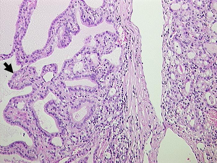 Links im Bild makropapilläre Proliferationen und ► Sanderson-Polster. Rechts aktivierte Follikel mit grossen Epithelzellen und praktisch fehlendem Kolloid.