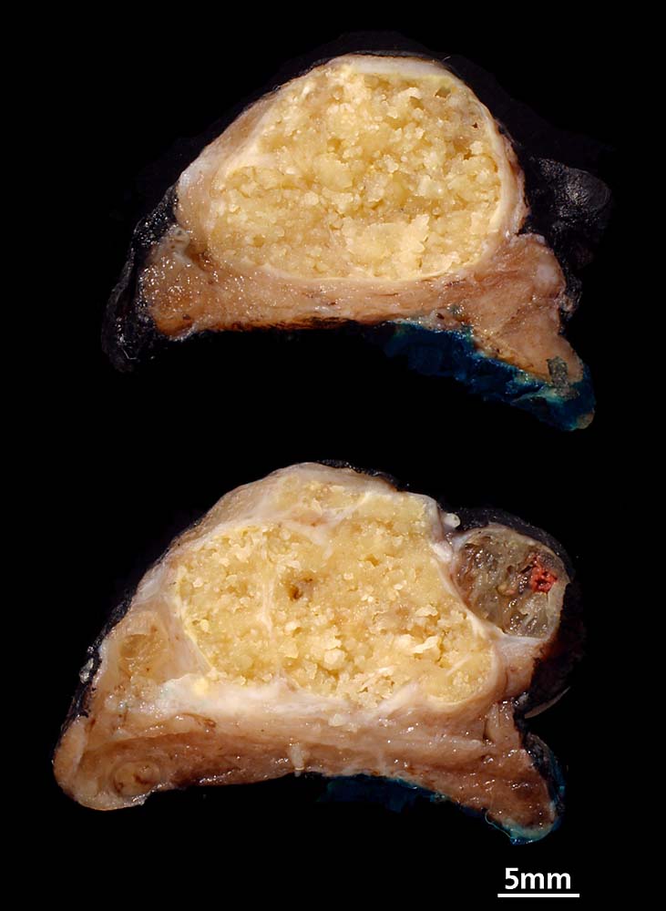 Ein scharf begrenzter, annähernd das ganze Resektat einnehmender, 4,5 cm im maximalen Durchmesser messender Knoten von gelb-brauner Farbe (papilläres Karzinom) und mit feinkörniger Schnittfläche. Daneben ein