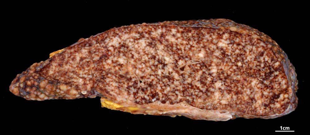 Die Milz wird durchsetzt von kleinen weissen knotigen Lymphominfiltraten.