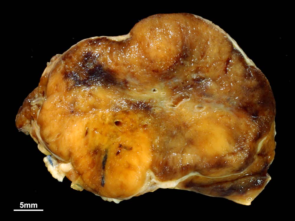 Inseln von gleichförmigen Zellen mit amphophilem Zytoplasma. Herdförmige Zell-kerngrössenvariabilität mit wenigen Mitosen. Der Proliferationsindex beträgt weniger als 5 %. Die Tumorzellen zeigen eine Posivität für Chromogranin und Synaptophysin. Sie sind negativ für S100.