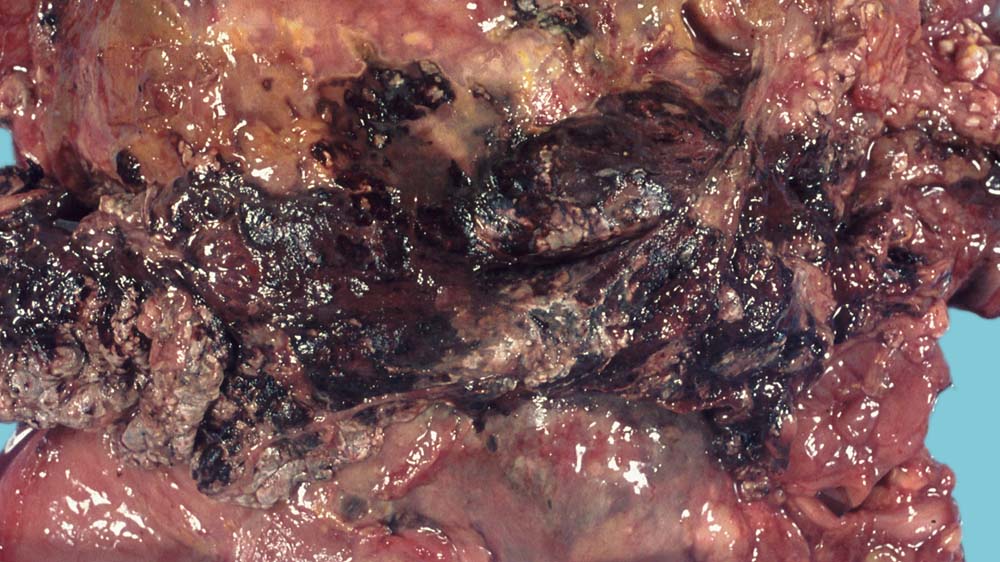 Hämorrhagische Nekrose des Pankreas und der angrenzenden Weichteile.