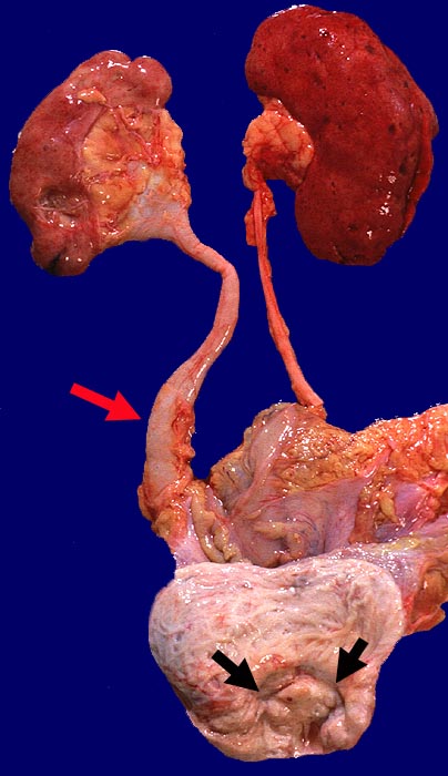 Metastasierendes Adenokarzinom der Prostata. Hydronephrose rechts.