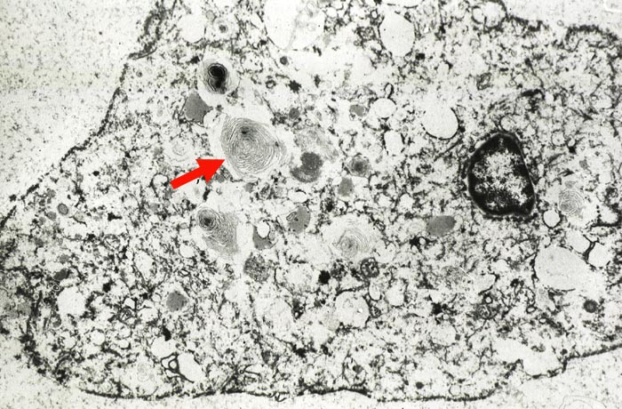 Im Zytoplasma des Pneumozyten zahlreiche konzentrisch geschichtete an Myelin erinnernde ► Einschlüsse.