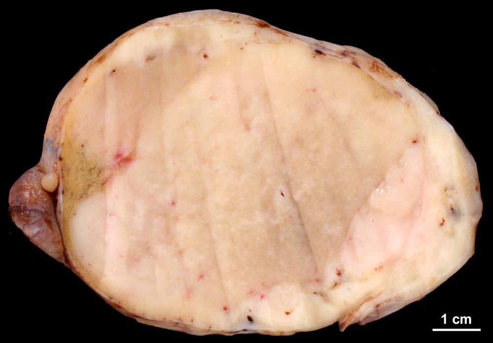 Beiges fischfleischartiges Tumorgewebe durchsetzt praktisch den gesamten Hoden.
