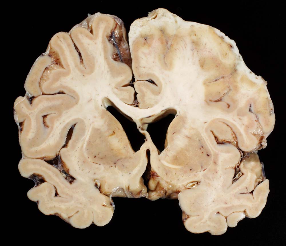 Die rechte Hemisphäre ist überzogen von einer Eiterschicht und der angrenzende Cortex ist nekrotisch.