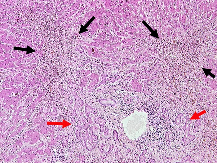 Zwischen den Pfeilen liegen ► Nekrosebrücken ausgehend von einem Portalfeld. Portalfeld mit ► Ductulusproliferationen.