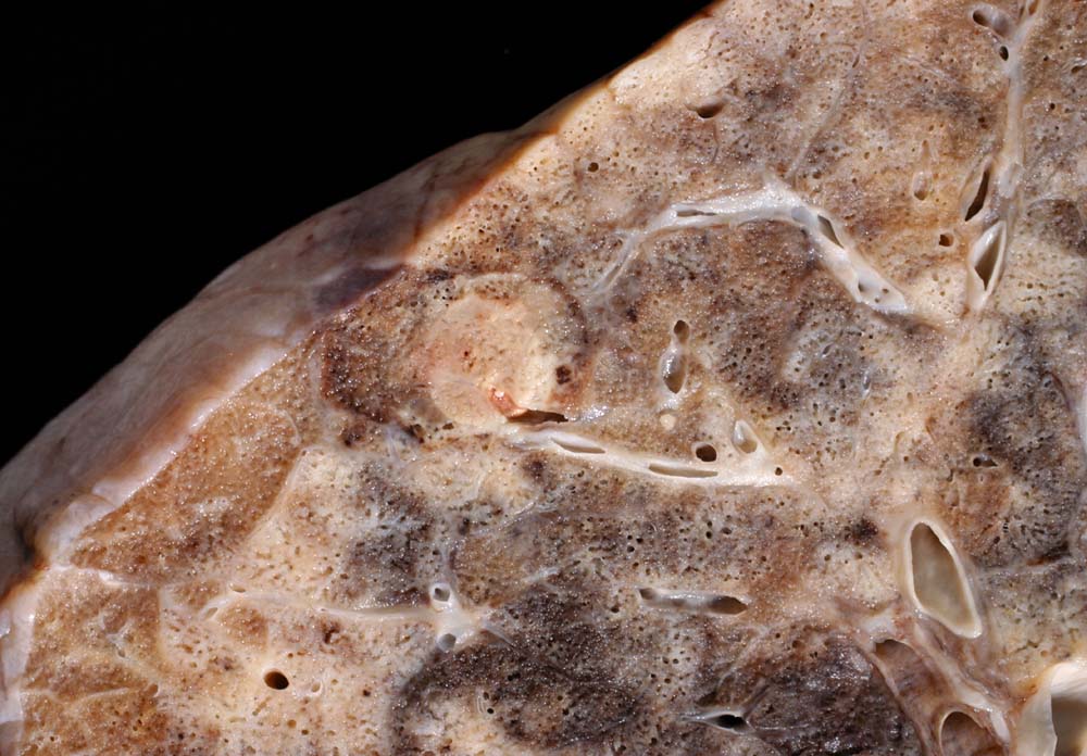 Die Alveolarsepten scheinen verbreitert und die Konsistenz des Lungenparenchyms erhöht.