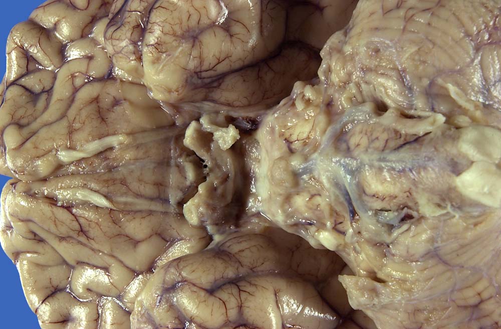 Basal betonte Meningitis mit trüb verfärbten und verdickten Meningen.
