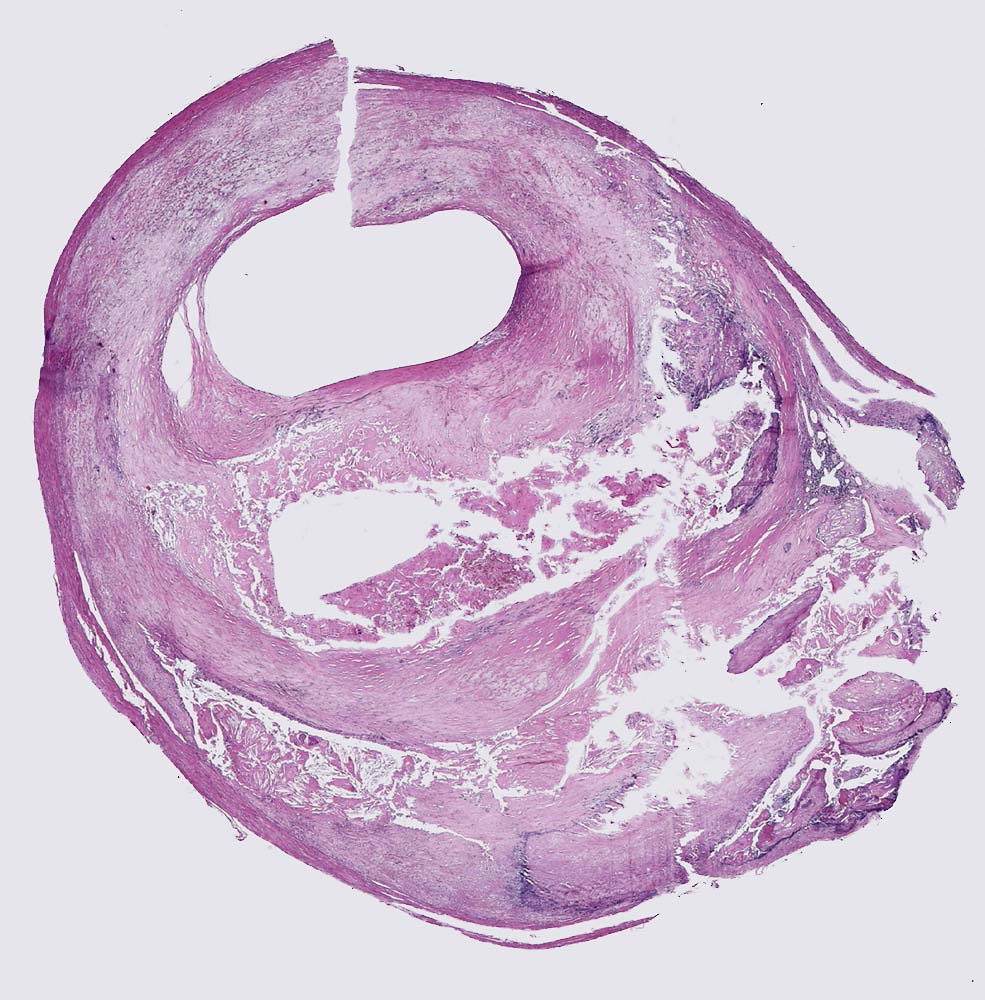 Das Lumen der Arterie ist exzentrisch stark eingeengt. In der fokal verkalkten Arterienwand finden sich zwei Atherome gefüllt mit Cholesterinkristallen und Detritus.