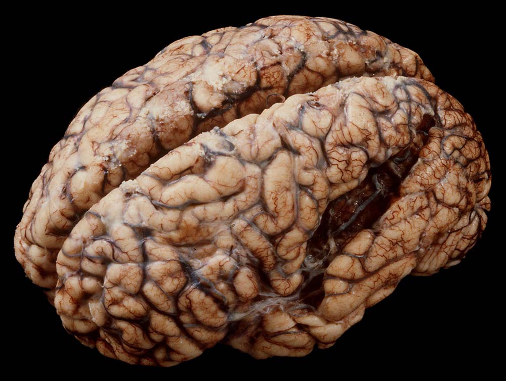 Alter Infarkt (Stadium III mit Anschluss an die äusseren Liquorräume) frontal (Höhe Ventrikelspitzen) bis okzipital links, mit weitgehender Aussparung der Basalganglien (Versorgungsgebiet der A.cerebri media). Ausgeprägte, zum Teil hochgradig stenosierende Arteriosklerose der Hirnbasisarterien, insbesondere der
