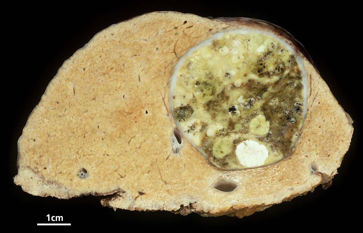 Grünlicher Tumor mit bunter Schnittfläche. Gegenüber dem umgebenden Lebergewebe ist der Tumor scharf abgegrenzt durch eine Pseudokapsel. Leberparenchym mit angedeuteter Nodularität, beige-gelb.