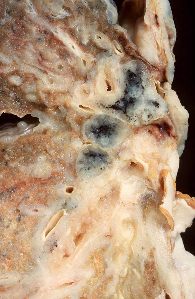 Ein weisser Saum von Tumorgewebe umgibt Luftwege und Pulmonalarterienäste.
