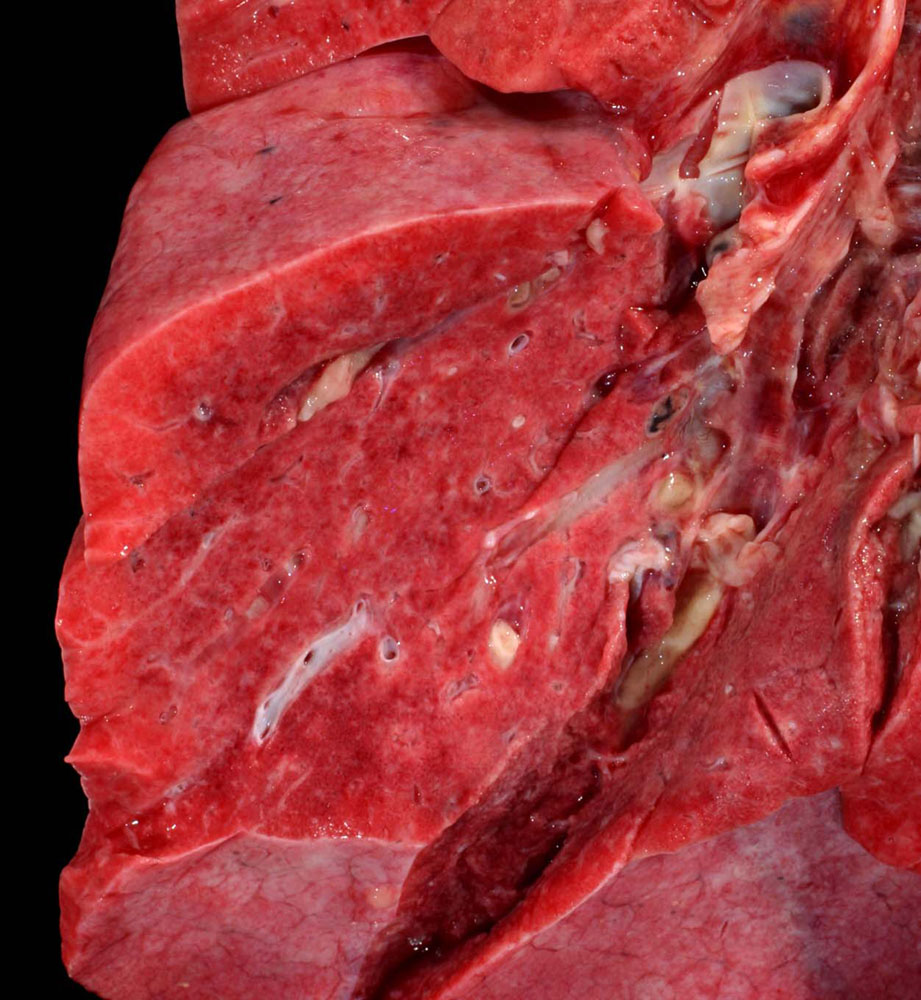 Schwerer diffuser Alveolarwandschaden in Organisation. Teilweise nekrotisierende Bronchopneumonie beidseits. Schockorgane: Niere, Leber. Einzelzellnekrosen des Myokards, vor allem rechts.
