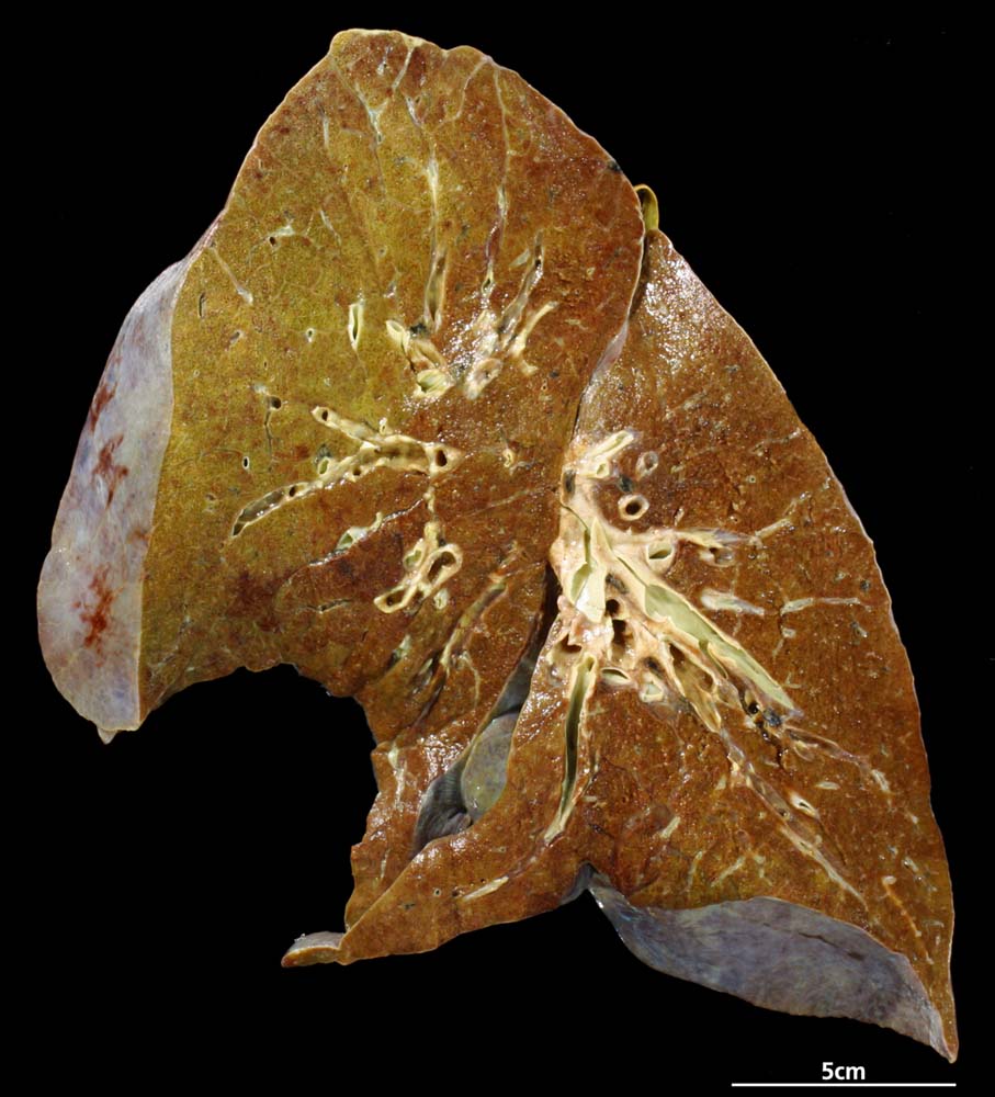 Sehr kompakt erscheinendes Lungenparenchym mit fokalen Einblutungen.