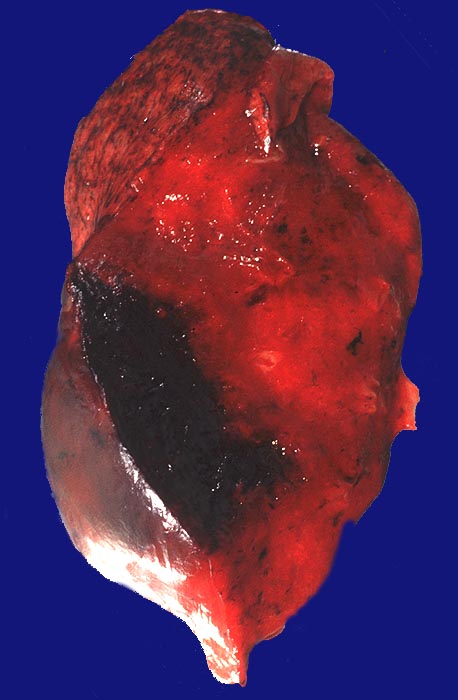 Dunkelroter, leicht erhabener dreieckiger Lungenherd mit Basis pleurawärts.