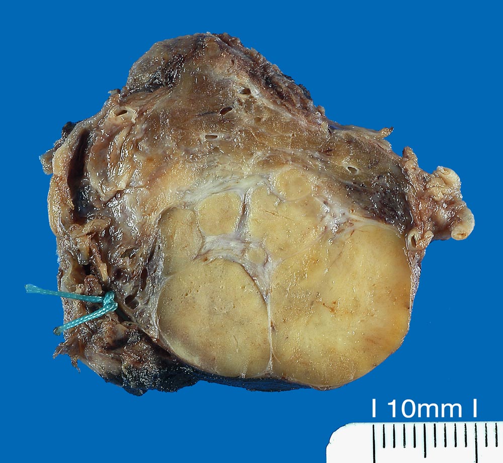 Multilobulierter beiger bekapselter Schilddrüsentumor mit makroskopisch erkennbarem Kapseldurchbruch.