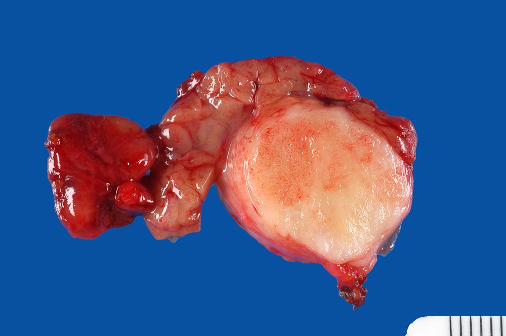 Innerhalb des makroskopisch unauffälligen Speicheldrüsengewebes findet sich ein bekapselter solider weissglänzender Tumor von 2cm Durchmesser.