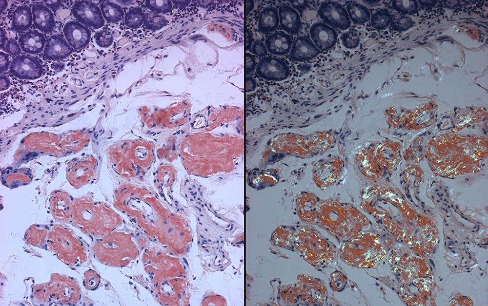 Azelluläre Amyloidablagerungen in den Gefässwänden der Submukosa der Duodenalschleimhaut. Flaschengrüne Doppelbrechung der Amyloidablagerungen (rechts).