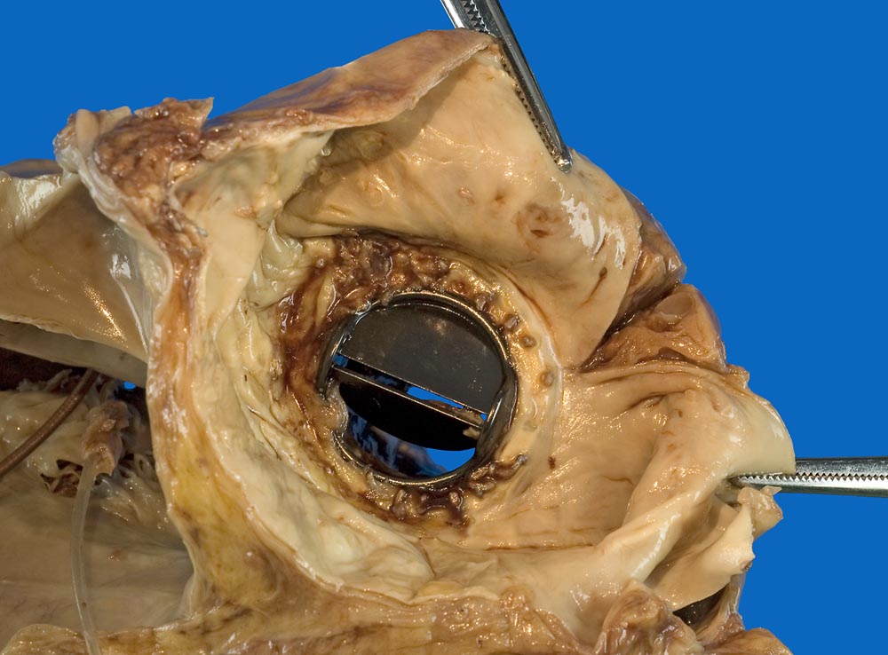 Am Rand der mechanischen Kunstklappe sind Ulzerationen und braune Verfärbungen des Endokards erkennbar.