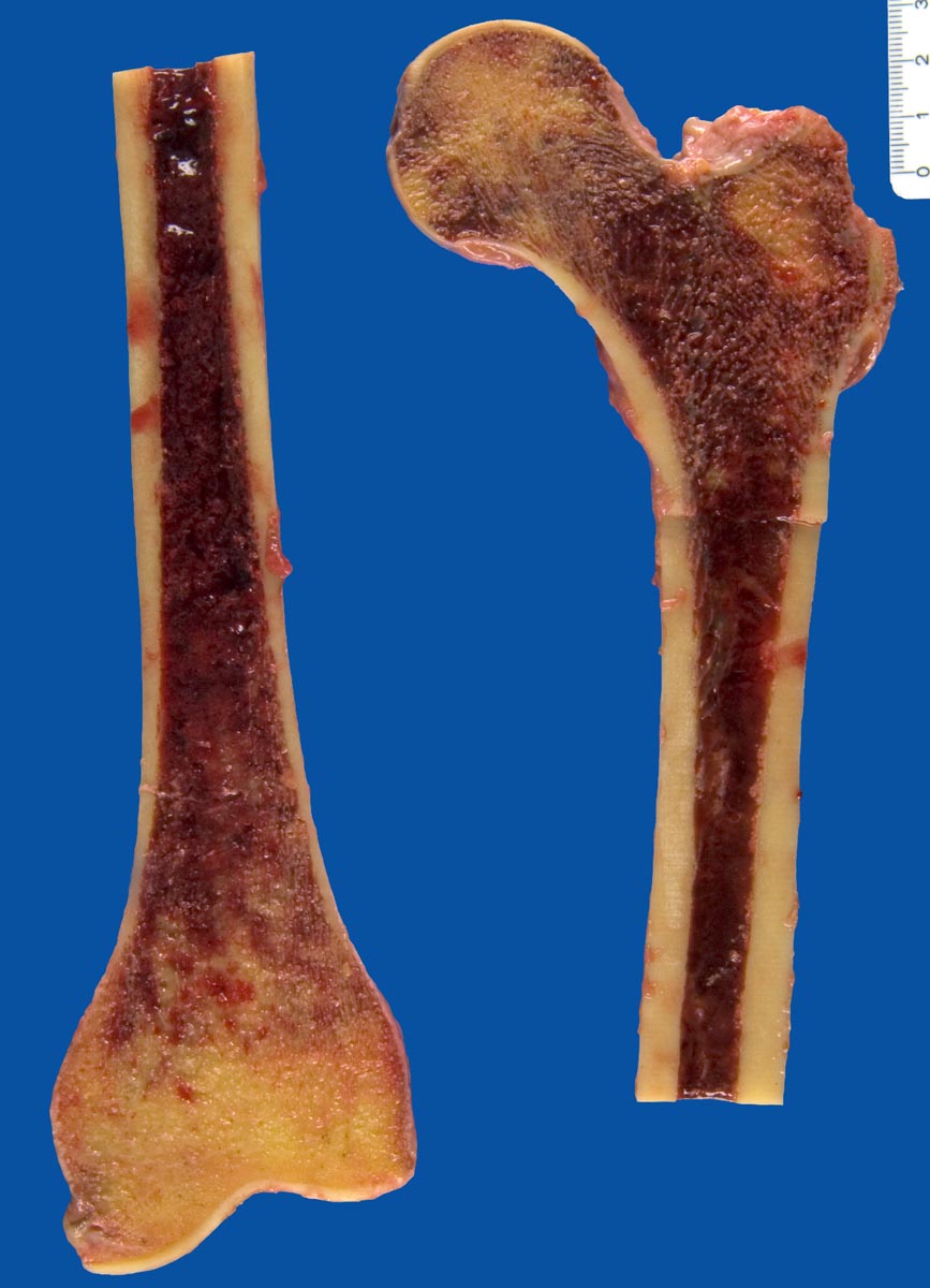Bei dieser 78 jährigen Patientin findet sich praktisch im ganzen Femur dunkelrotes Knochenmark. Das leukämische Infiltrat verdrängt das Fettmark bis auf ein kleines Areal im Bereich des distalen Femurs.