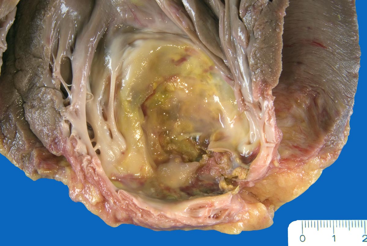Myokardinfarktnarbe im Bereich der Herzspitze (10x7 cm). Herzwandaneurysma im Bereich der Infarktnarbe (Dm 6 cm).