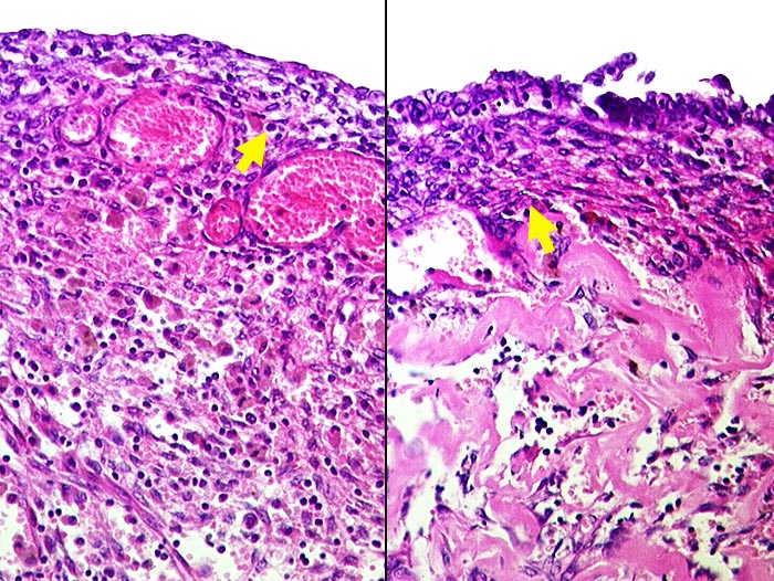 Auskleidung einer Schokoladezyste: links im Bild fehlt das Epithel. Ein schmaler Streifen endometranes ► Stroma ist sichtbar. Darunter zahlreiche Hämosiderinhaltige Makrophagen. Rechts ist das Epithel erhalten.